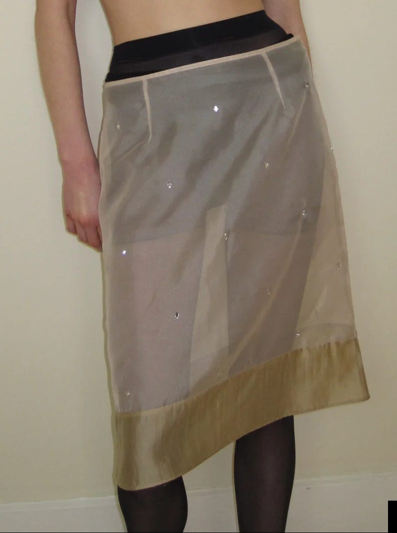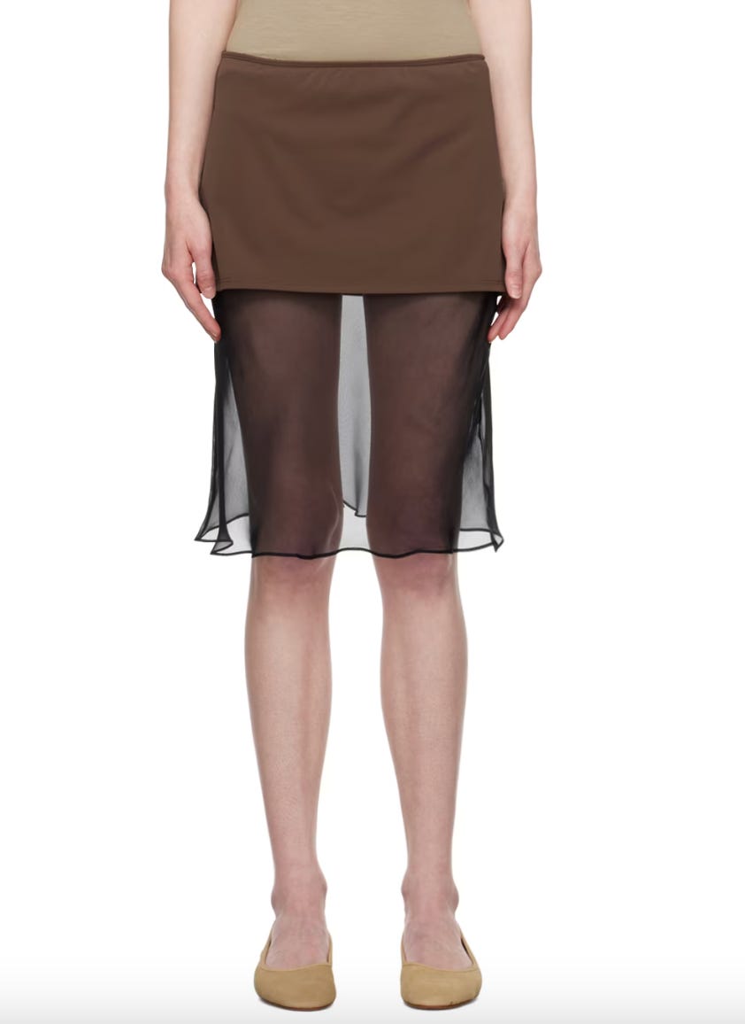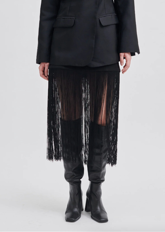 See through skirts, in light materials like organza (dreamy Prada 1), thin knit, fringes (dreamy Prada 2) are the season must have. A bit Saint Laurent AW24, a bit Bella Baxter too.